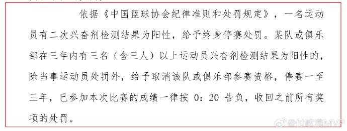 根据中国篮协今天公布的《中国篮球协会篮球运动队参赛指引)(意见征集稿)显示:“如果一名篮球运动员有二次兴奋剂检测结果为阳性,给予终身停赛处罚。某队或俱乐部在三年内有三名(含三人)以上运动员兴奋剂检测结果为阳性的,除当事运动员处罚外,给予取消该队或俱乐部参赛资格,停赛一至三年,已参加本次比赛的成绩一律按 0:20 告负,收回之前所有奖项的处罚。”