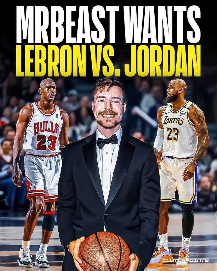 8月4日讯 今日,据ClutchPoints报道,YouTube顶流博主MrBeast提议让勒布朗-詹姆斯和迈克尔-乔丹进行一对一决战。
