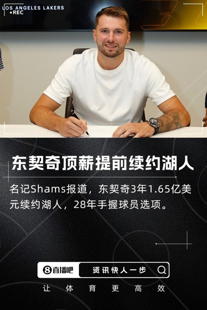 08月03日讯 名记Shams报道,东契奇3年1.65亿美元顶薪提前续约湖人!