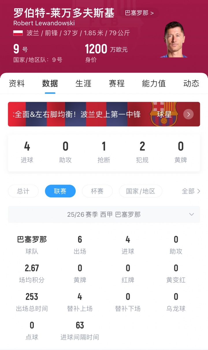 莱万现年37岁,他本赛季至今为巴萨出战6场西甲,打进4球,现身价1200万欧,他与巴萨的合同将于明年到期。