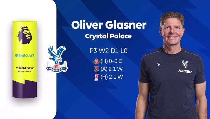 51岁的格拉斯纳(2024年2月上任)成为继2020年7月拉尔夫-哈森许特尔(南安普顿)后第二位获此殊荣的奥地利籍主帅,也是自2014年4月托尼-普利斯后首位获奖的水晶宫主帅。