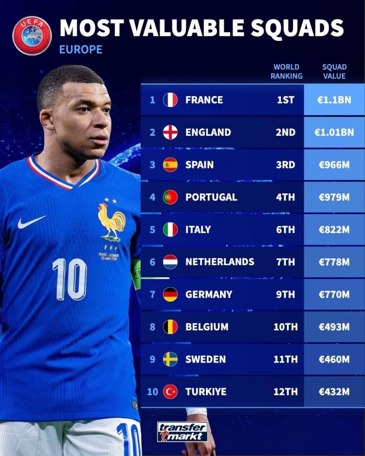 10月12日讯 德国转会市场网近日更新欧洲国家队身价排名,法国队以11亿欧元总身价高居榜首,英格兰(10.1亿欧)与葡萄牙(9.79亿欧)分列二、三位↓(转会市场图片中将西班牙与葡萄牙标反,应为葡萄牙第三、西班牙第四)