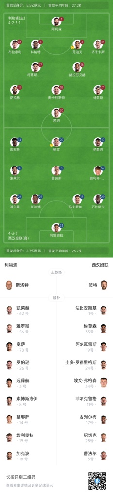 04月13日讯 北京时间今晚21点,英超第32轮,利物浦主场迎战西汉姆,赛前双方首发阵容出炉。
