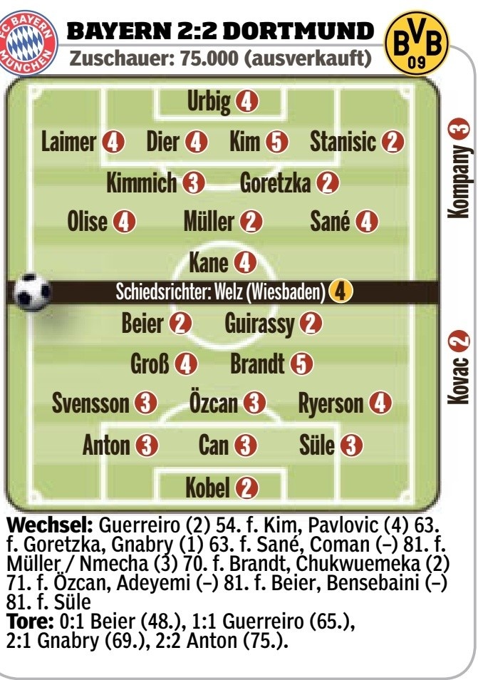 4月13日讯 北京时间今天凌晨,拜仁在德甲焦点战中主场2-2战平多特蒙德。在德媒《图片报》给出的评分中,拜仁中后卫金玟哉获最低分5分,多名球员只得到4分的低分。
