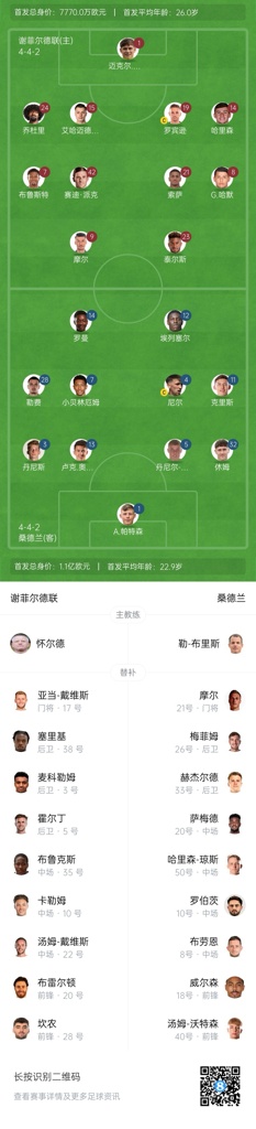 谢菲尔德联首发:1-迈克尔-库珀、14-哈里森-布鲁斯、15-艾哈迈德奥德季奇、19-罗宾逊、8-哈默、21-索萨、24-乔杜里、42-派克、7-布鲁斯特、9-摩尔、23-泰尔斯-坎贝尔
