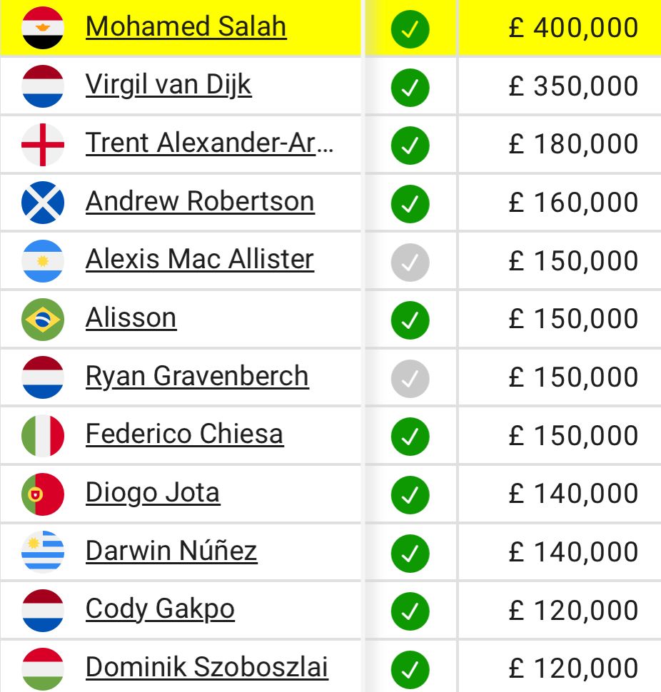目前利物浦队内周薪第三的阿诺德即将离队,周薪过10万镑的球员还包括罗伯逊、麦卡利斯特、阿利森、赫拉芬贝赫、基耶萨、若塔、努涅斯、加克波以及索博斯洛伊。