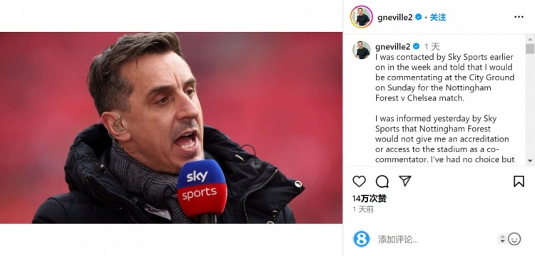 曾批评诺丁汉森林老板马里纳基斯的内维尔被禁止入场解说比赛,内维尔在社交媒体上发文谈到了这一话题。