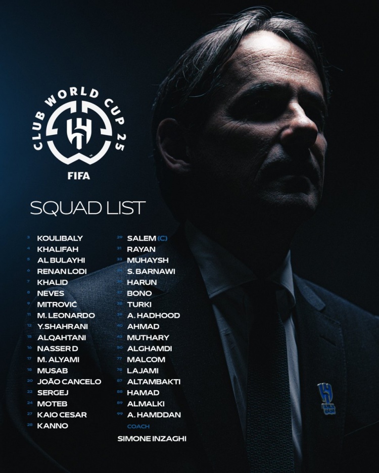 中场:8-鲁本-内维斯、16-纳赛尔-多萨里、18-穆萨布、22-米林科维奇、28-卡努、33-穆罕默德-穆哈什、39-哈德胡德、77-马尔科姆、89-阿布杜拉-阿尔马尔基