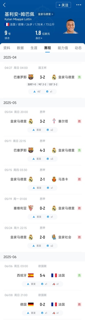 本场比赛皇马的头号射手姆巴佩因病缺席,他的缺战对皇马来说损失重大。皇马在此前的6场比赛一共打进14球,姆巴佩一个人就轰入了10球,堪称皇马的超级攻城锤。不仅如此,姆巴佩在这期间还踢了两场法国国家队比赛,同样均有进球贡献。