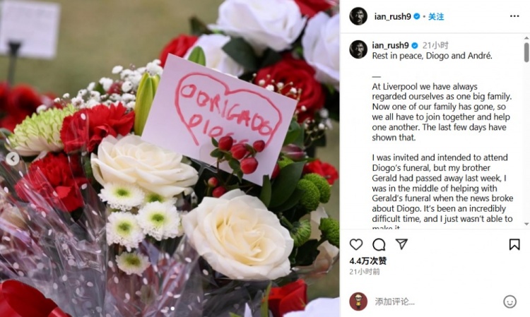 7月7日讯 利物浦名宿伊恩-拉什在Instagram发文,解释自己为何缺席了迪奥戈-若塔的葬礼。