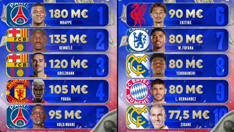 7月24日讯 利物浦已经官宣签下法兰克福前锋埃基蒂克,Actu Foot数据统计显示他也是法国历史转会费第6贵的球员。
