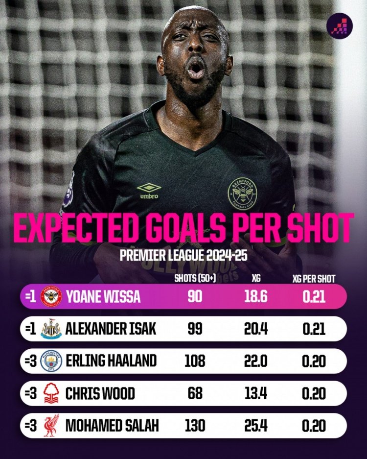 据Opta数据统计,在上赛季英超,球员每次射门预期进球数榜单中,维萨和伊萨克以0.21球排名榜首,哈兰德、萨拉赫、伍德并列第三。
