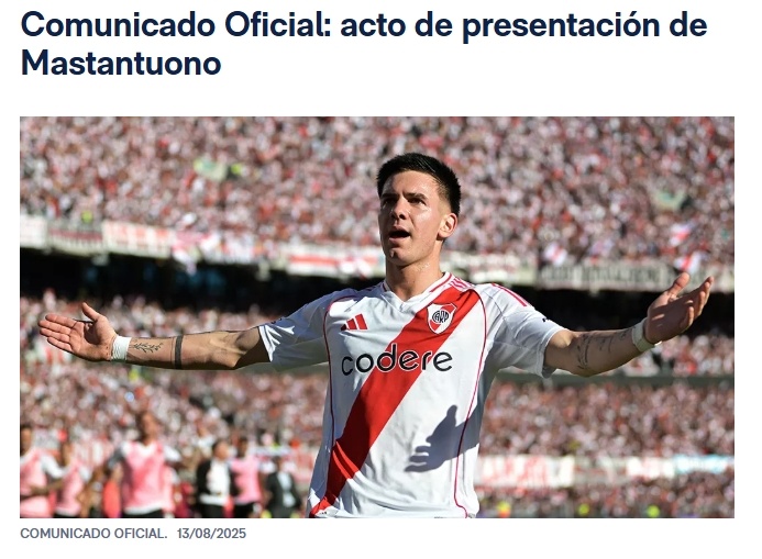 今年6月,皇马官宣签下马斯坦托诺,根据河床官方的说法,马斯坦托诺的转会总价高达6320万欧元,成为阿根廷足坛史上最贵转会。除去税费等其他费用,河床俱乐部将收到4500万欧的转会费。